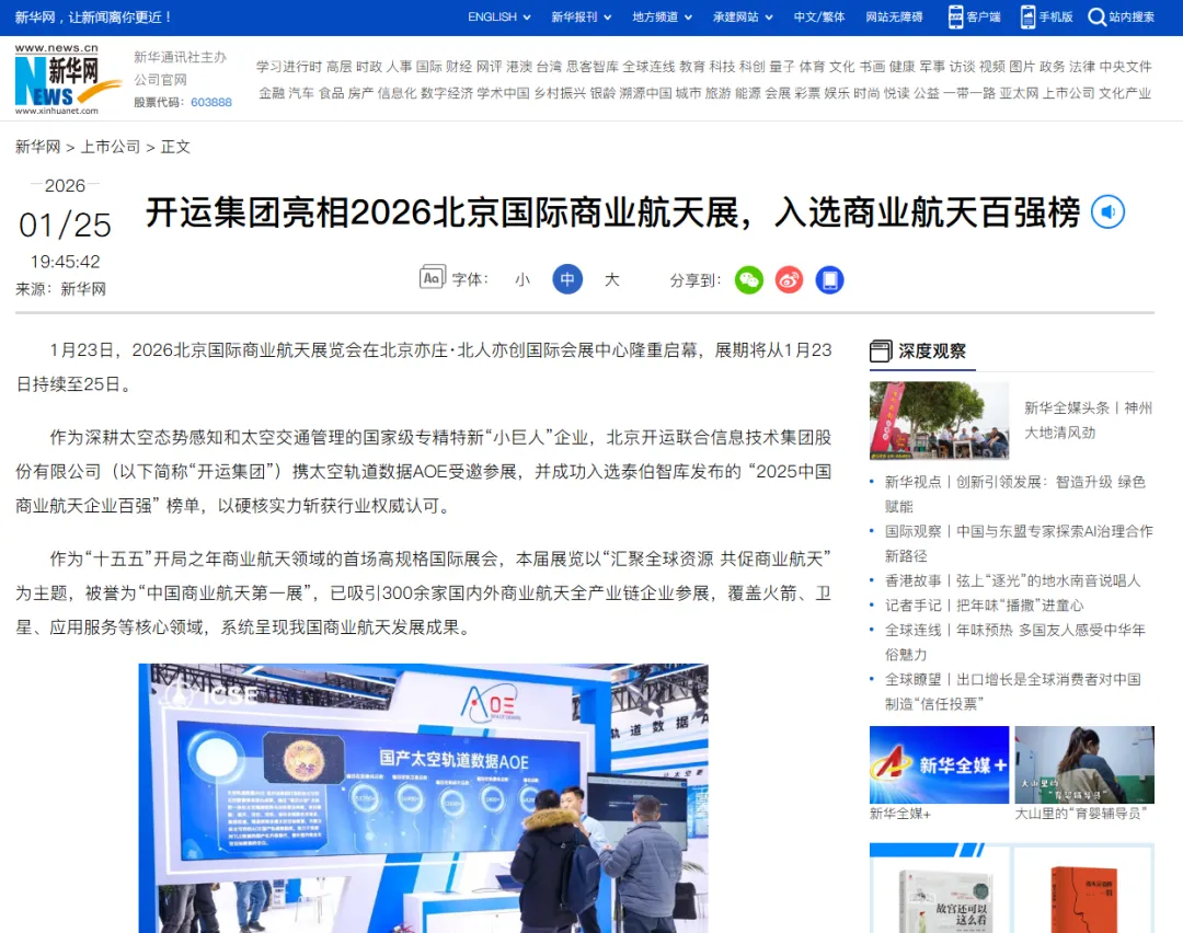 太空轨道数据AOE在2026北京国际商业航天展期间,获新华网、央视等多家媒体重点报道。报道聚焦商业航天高质量安全发展趋势,深入解读太空轨道数据作为商业航天核心资产的重要价值,集中展示了开运集团在星汉计划、天选计划、太空轨道数据AOE等领域的最新成果,全方位呈现了开运集团作为国家级专精特新“小巨人”企业的技术实力与责任担当。