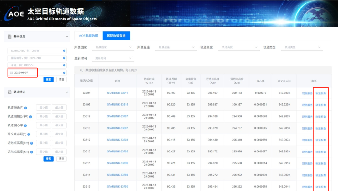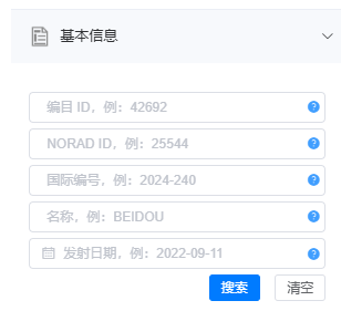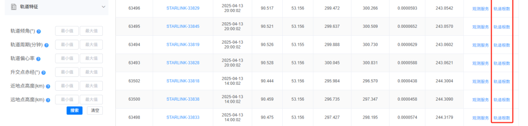 支持通过卫星ID、国际编号、发射日期等信息进行查询卫星轨道数据。