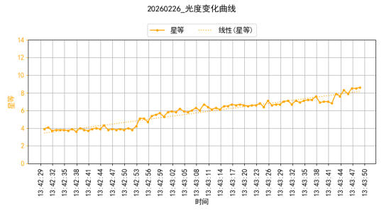 2、STARLINK-4200于2026年02月26日进行跟踪观测,共采集图像85张,星等变化范围3.6-8.6,定位结果与预测位置相符。