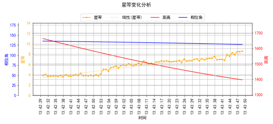 变化的趋势:光度曲线星等值总体呈现出上升趋势,趋势变化明显。(卫星星等受观测相位角、距离和卫星姿态、形状等共同影响)。