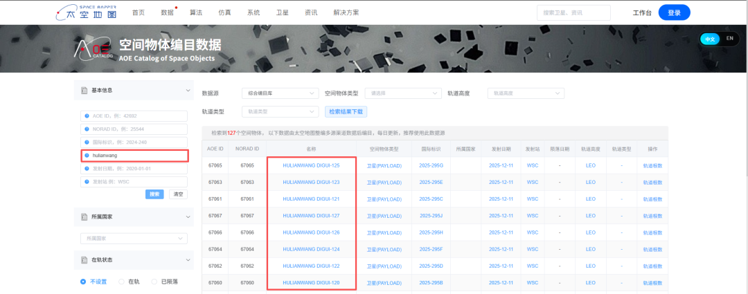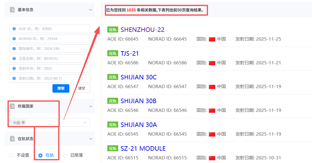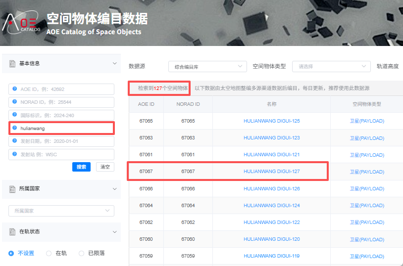 可以通过输入卫星ID、国际编号、发射日期等任一关键信息进行查询: