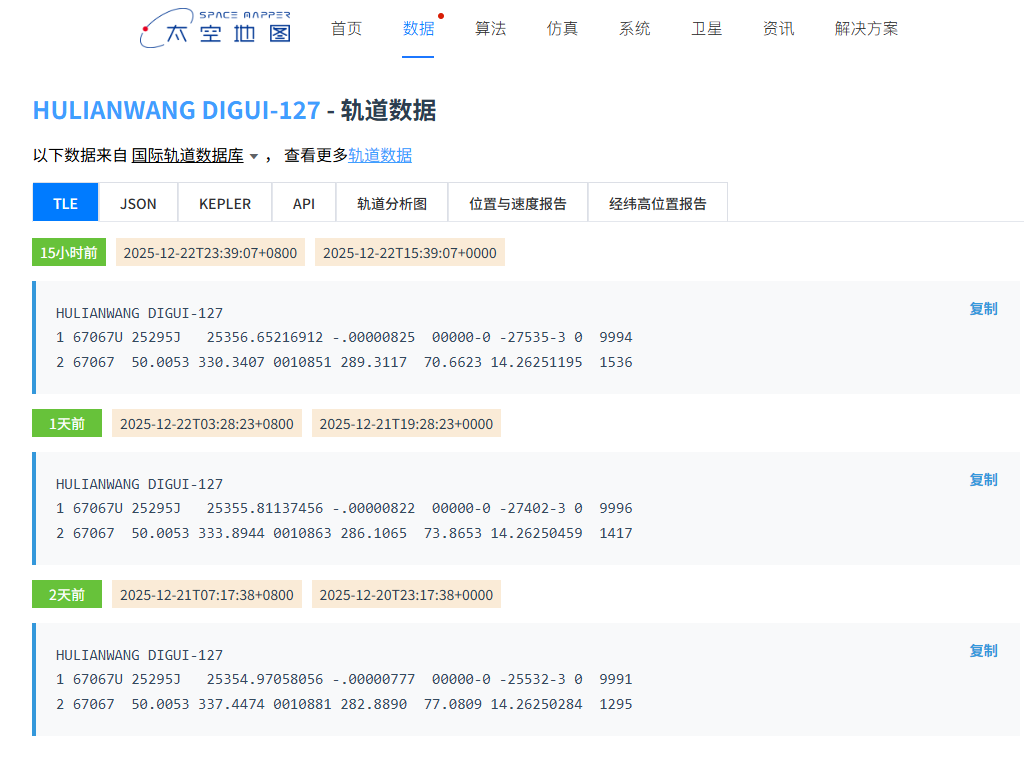 点击任一星座目标右侧的轨道根数即可查询对应卫星轨道数据: