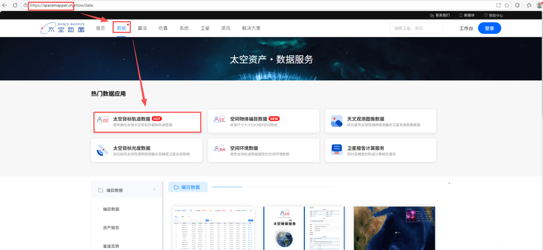 在浏览器输入太空地图网址(https://spacemapper.cn),选择顶部导航栏中的数据,选择“太空目标轨道数据”: