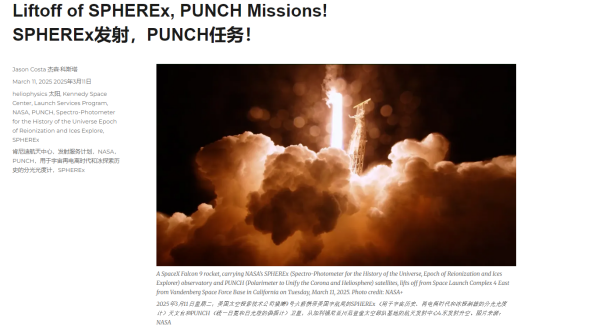 2025年2月26日。NASA和SpaceX现在的目标是不早于3月2日(周日)发射该机构的SPHEREx和PUNCH任务。新的日期将允许团队在发射前进行火箭处理的额外时间。发射时间定于美国东部时间晚上10点09分(太平洋标准时间晚上7点09分)。