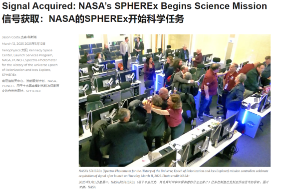 SPHEREx(全称:宇宙历史、再电离时代分光光度计和冰探测器)是由美国国家航空航天局(NASA)主导、喷气推进实验室(JPL)管理的一项天体物理学任务,加州理工学院负责科学主导,BAE系统公司承建,韩国天文研究院等国际机构参与研制。该卫星于2025年3月12日由SpaceX猎鹰9号火箭(B1088.3)从加州范登堡太空军基地成功发射。SPHEREx重500公斤,能耗仅270-300W(低于家用冰箱),搭载102通道分光光度计,覆盖0.75-5.0微米红外波段,灵敏度较现有设备提升百倍。其核心科学目标包括:验证宇宙暴胀理论、探测星际冰层、研究星系演化。卫星部署于700公里高的太阳同步极地轨道,采用被动冷却技术(-210℃)和三重锥形遮光罩以隔绝热干扰,计划在两年内完成4次全天扫描,并与詹姆斯·韦布望远镜协同观测。