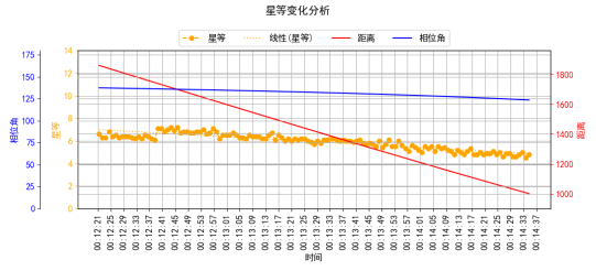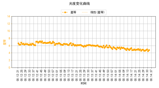 变化的趋势:光度曲线星等值总体呈现出下降趋势,趋势变化较小。(卫星星等受观测相位角、距离和卫星姿态、形状等共同影响)。