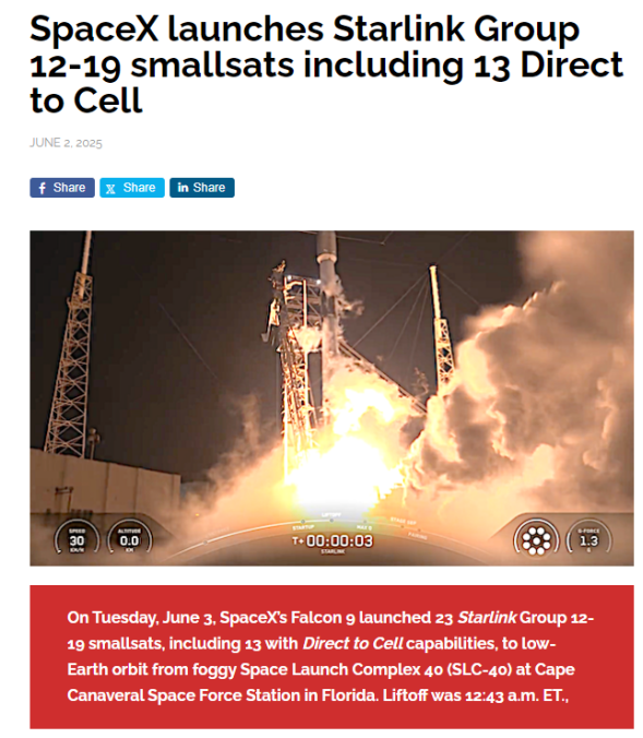 1.2025年6月3日,Starlink第12-19组23颗卫星搭乘猎鹰9号在佛罗里达州卡纳维拉尔角太空基地成功发射。