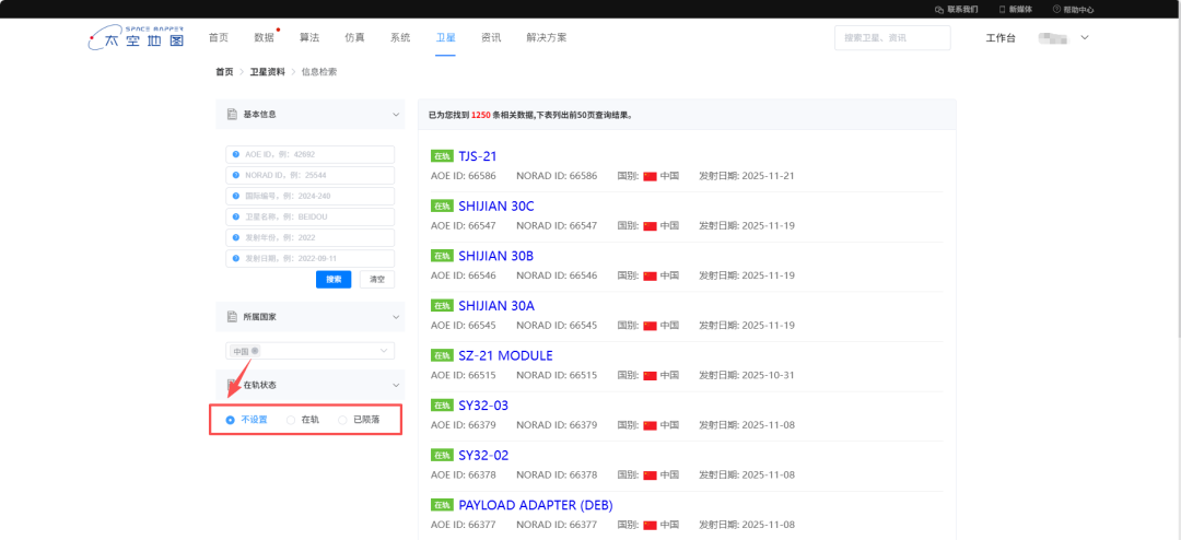 选择任一国家,即可查看其编目总数、在轨数和陨落数。