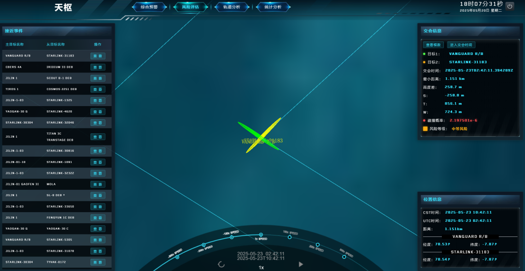 同时,通过AOE轨道高度、速度等分析图,可精准捕捉卫星轨道漂移等异常,提供碰撞风险分析、高风险交汇事件预警及规避建议,形成完整的预警报告体系。