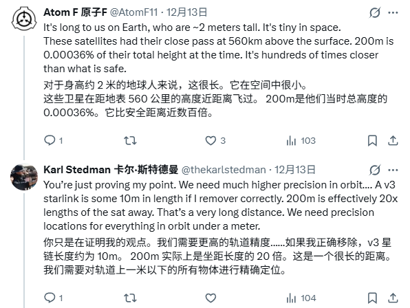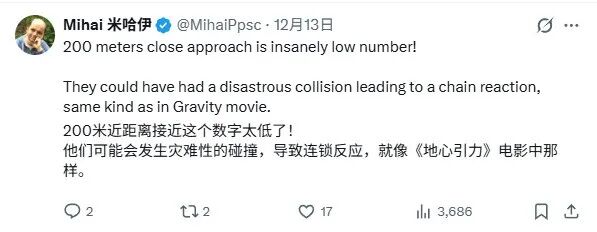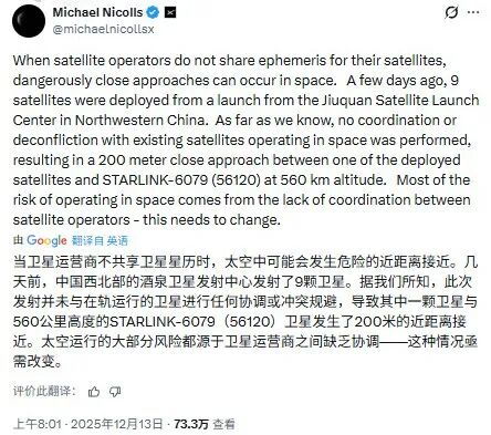 12月13日,SpaceX星链工程副总裁迈克尔·尼科尔斯公开发声,称其中一颗卫星在560公里轨道高度,与星链STARLINK-6079卫星近距离接近至200米,险些相撞。