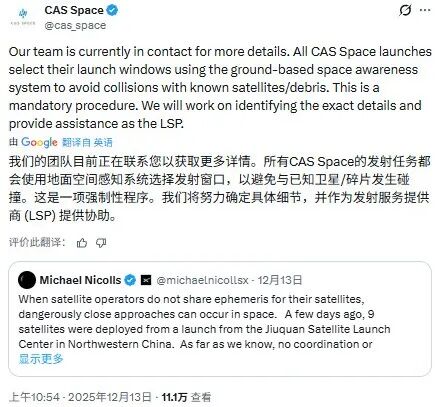当日中科宇航回应:其所有发射任务均会使用地面空间感知系统选择发射窗口,以避免与已知卫星或碎片发生碰撞,并强调这是一项强制性程序。