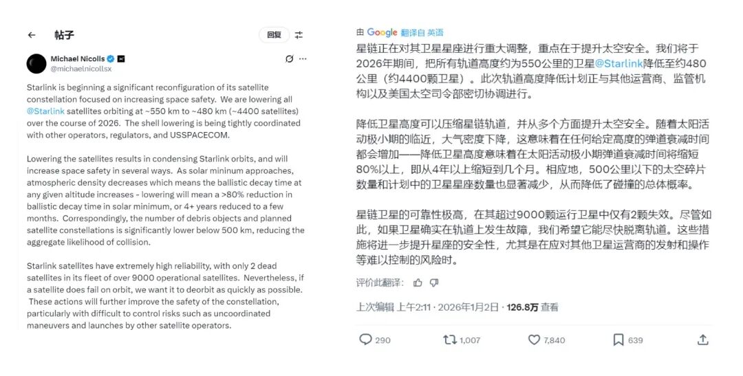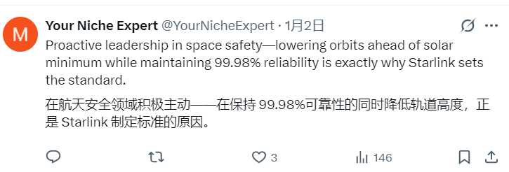 在2025年12月卫星失效事件的官方回应中,星链官方明确表示该颗卫星不会对国际空间站造成影响。但是,在本次事件中,星链方尚未就相关问题表态。毕竟此次大规模降轨涉及4400颗卫星,轨道调整过程中的不可控因素较多。