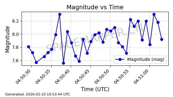 | QIANFAN-108 | 66050 | 66050 | 2025-10-17 同日期轨道 2025-233T 同批次轨道 | 在轨 | 107分钟 | 88.9912 | 1066.935 | 1070.273 | 0.0002241 | 2026-02-16 06:12:15 | ![]() |