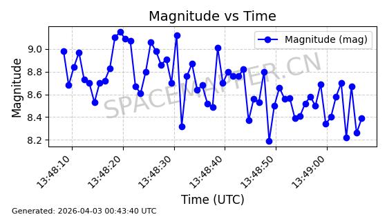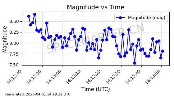 | QIANFAN-63 | 62793 | 62793 | 2025-01-23 同日期轨道 2025-016J 同批次轨道 | 在轨 | 107分钟 | 88.9681 | 1055.603 | 1081.503 | 0.0017389 | 2026-04-02 06:29:39 | ![]() | |