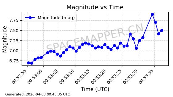 | QIANFAN-70 | 62800 | 62800 | 2025-01-23 同日期轨道 2025-016R 同批次轨道 | 在轨 | 107分钟 | 88.9677 | 1056.479 | 1080.625 | 0.0016212 | 2026-04-02 06:59:18 | ![]() | |