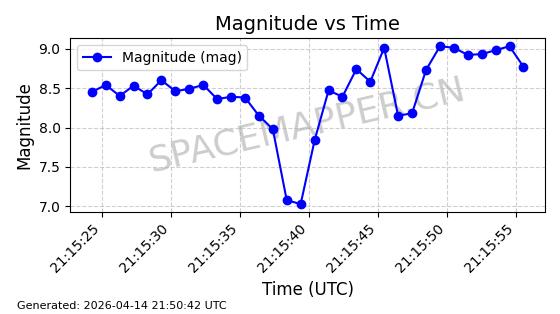 | STARLINK-2374 | 47913 | 47913 | 2021-03-14 同日期轨道 2021-021BF 同批次轨道 | 已陨落 | 87分钟 | 53.0334 | 142.212 | 158.564 | 0.0012523 | 2025-01-26 23:34:30 | ![]() | |