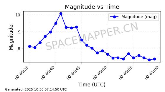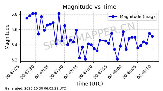 | STARLINK-2540 | 48290 | 48290 | 2021-04-29 同日期轨道 2021-036Q 同批次轨道 | 在轨 | 95分钟 | 53.0540 | 514.953 | 517.569 | 0.0001897 | 2025-10-30 08:00:02 | ||