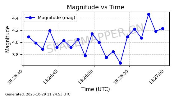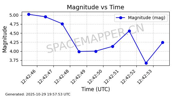 | STARLINK-11133 | 59954 | 59954 | 2024-06-05 同日期轨道 2024-107K 同批次轨道 | 在轨 | 92分钟 | 53.1586 | 359.045 | 360.465 | 0.0001053 | 2025-10-27 21:53:27 | ||