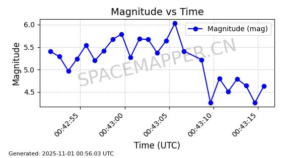 | STARLINK-30425 | 57850 | 57850 | 2023-09-12 同日期轨道 2023-141L 同批次轨道 | 在轨 | 94分钟 | 53.1613 | 474.35 | 476.164 | 0.0001322 | 2025-10-29 22:18:44 |  | |