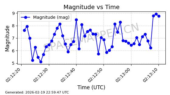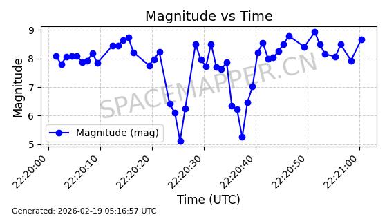 | STARLINK-3619 | 51787 | 51787 | 2022-02-25 同日期轨道 2022-017V 同批次轨道 | 在轨 | 95分钟 | 53.2169 | 538.813 | 540.687 | 0.0001354 | 2026-02-19 01:23:30 | ||