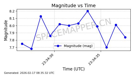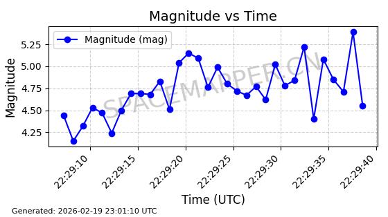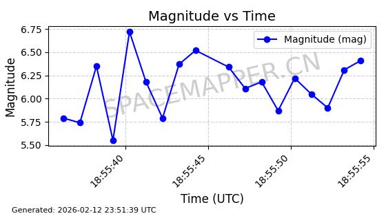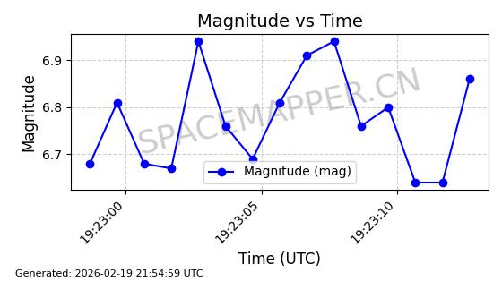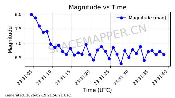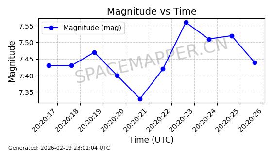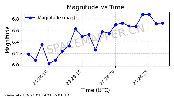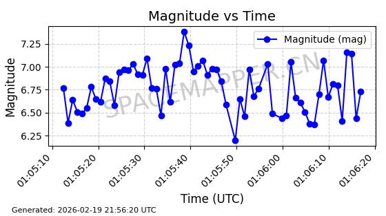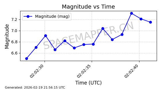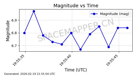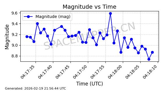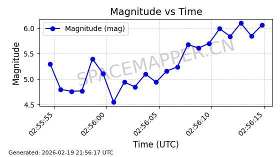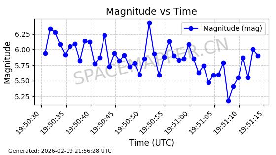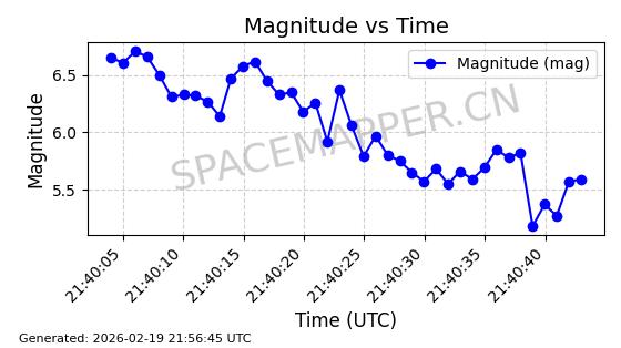 | STARLINK-3617 | 51780 | 51780 | 2022-02-25 同日期轨道 2022-017N 同批次轨道 | 在轨 | 95分钟 | 53.2170 | 538.806 | 540.684 | 0.0001357 | 2026-02-19 07:03:59 | ||