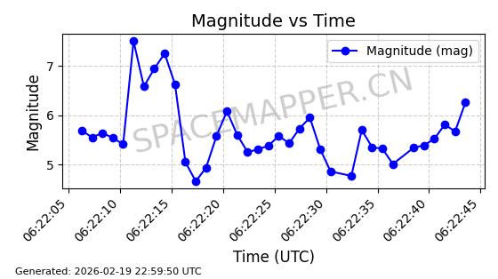 | STARLINK-3620 | 51775 | 51775 | 2022-02-25 同日期轨道 2022-017H 同批次轨道 | 在轨 | 95分钟 | 53.2173 | 538.842 | 540.674 | 0.0001324 | 2026-02-19 01:24:50 | ||