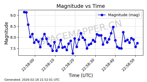 | STARLINK-3639 | 51789 | 51789 | 2022-02-25 同日期轨道 2022-017X 同批次轨道 | 在轨 | 95分钟 | 53.2171 | 538.838 | 540.666 | 0.0001320 | 2026-02-18 10:49:08 | ||
