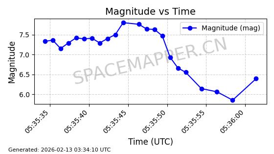 | STARLINK-3872 | 52453 | 52453 | 2022-05-06 同日期轨道 2022-049C 同批次轨道 | 在轨 | 95分钟 | 53.2182 | 539.048 | 540.432 | 0.0001000 | 2026-02-18 21:25:01 | ||