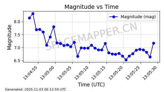| STARLINK-31578 | 59321 | 59321 | 2024-03-25 同日期轨道 2024-057B 同批次轨道 | 在轨 | 94分钟 | 43.0029 | 482.439 | 483.731 | 0.0000941 | 2025-11-01 09:33:08 | ||