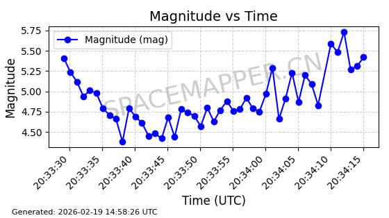 | STARLINK-4609 | 53619 | 53619 | 2022-08-28 同日期轨道 2022-104AH 同批次轨道 | 在轨 | 95分钟 | 53.2182 | 538.807 | 540.721 | 0.0001383 | 2026-02-18 01:45:18 | ||