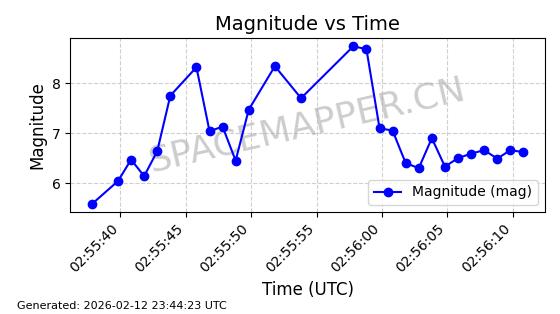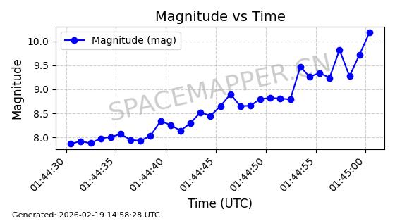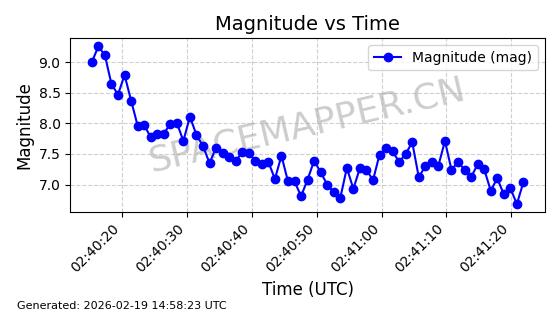 | STARLINK-4464 | 53669 | 53669 | 2022-08-31 同日期轨道 2022-105X 同批次轨道 | 在轨 | 96分钟 | 97.6055 | 562.586 | 563.382 | 0.0000573 | 2026-02-18 05:21:25 | ||