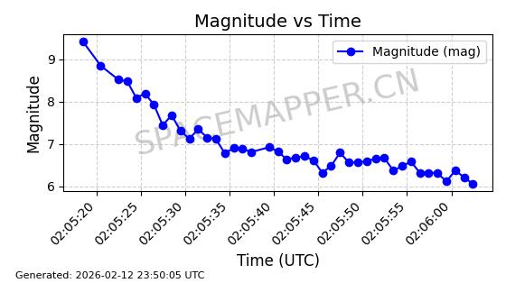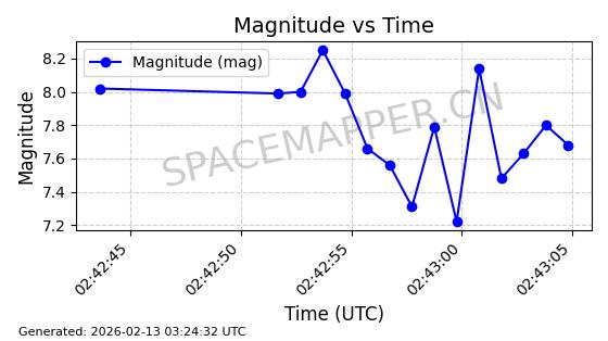 | STARLINK-4463 | 53659 | 53659 | 2022-08-31 同日期轨道 2022-105M 同批次轨道 | 已陨落 | 87分钟 | 97.5765 | 130.949 | 142.535 | 0.0008891 | 2026-02-07 06:20:05 | ||