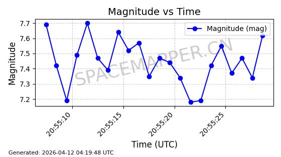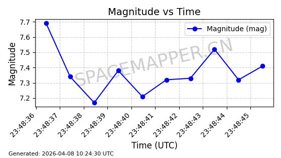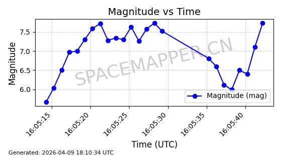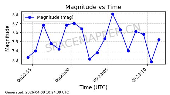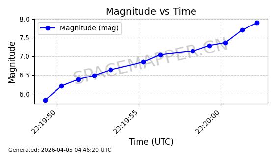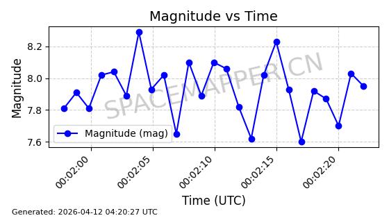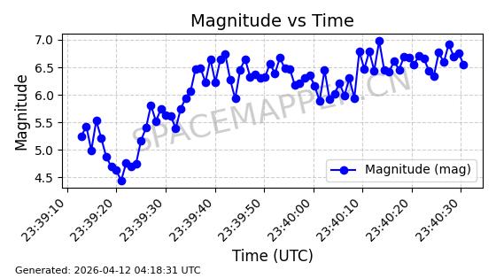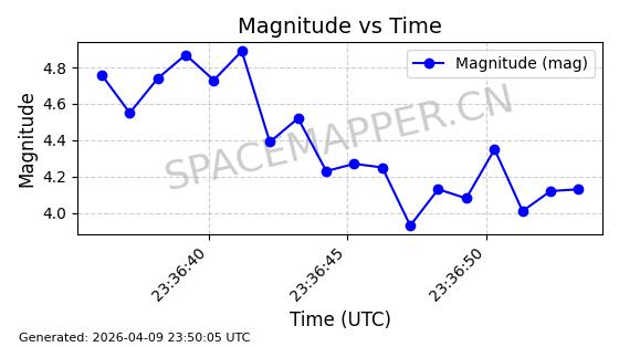 | STARLINK-31895 | 59849 | 59849 | 2024-05-23 同日期轨道 2024-097Q 同批次轨道 | 在轨 | 94分钟 | 43.0029 | 482.355 | 483.757 | 0.0001021 | 2026-04-11 00:37:51 | ||