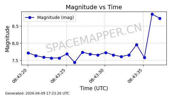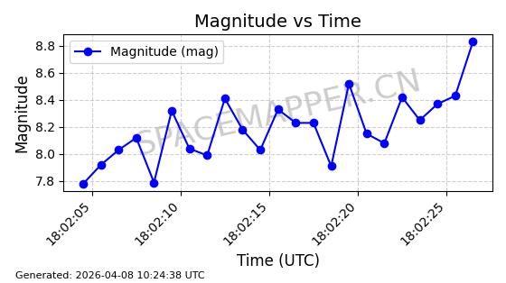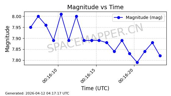 | STARLINK-31882 | 59855 | 59855 | 2024-05-23 同日期轨道 2024-097W 同批次轨道 | 在轨 | 94分钟 | 43.0007 | 482.217 | 483.893 | 0.0001220 | 2026-04-11 07:03:16 | ||