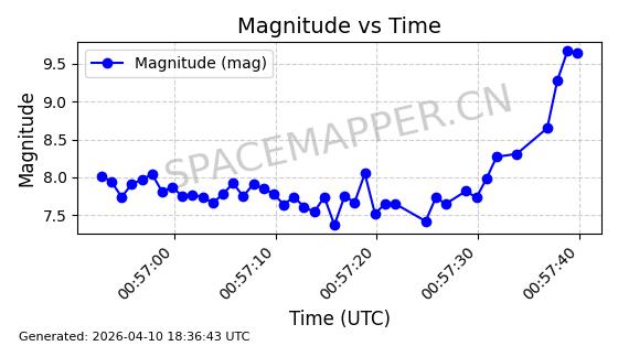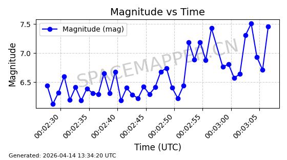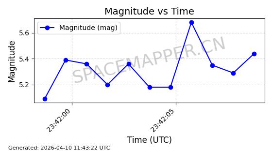 | STARLINK-32000 | 60289 | 60289 | 2024-07-28 同日期轨道 2024-132M 同批次轨道 | 在轨 | 94分钟 | 53.1606 | 474.902 | 475.524 | 0.0000453 | 2026-04-12 16:28:37 | ||