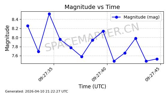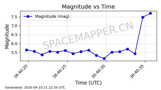 | STARLINK-32107 | 59694 | 59694 | 2024-05-08 同日期轨道 2024-086N 同批次轨道 | 在轨 | 94分钟 | 43.0036 | 482.245 | 483.883 | 0.0001193 | 2026-04-10 16:37:41 | ||