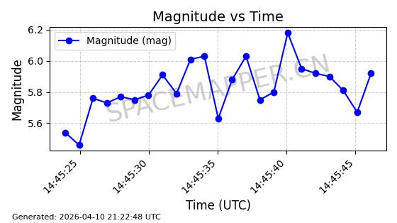 | STARLINK-32145 | 60154 | 60154 | 2024-06-27 同日期轨道 2024-120V 同批次轨道 | 在轨 | 94分钟 | 53.1596 | 474.34 | 476.186 | 0.0001346 | 2026-04-11 04:23:21 | ||