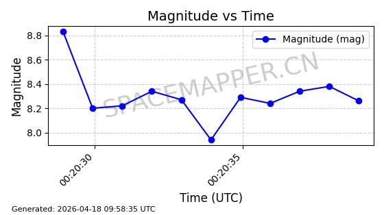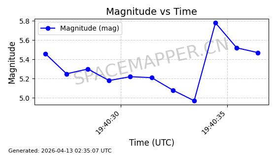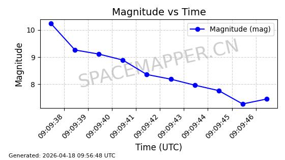 | STARLINK-32082 | 60346 | 60346 | 2024-08-02 同日期轨道 2024-136T 同批次轨道 | 在轨 | 94分钟 | 53.1588 | 474.901 | 475.461 | 0.0000408 | 2026-04-16 16:23:17 | ||
