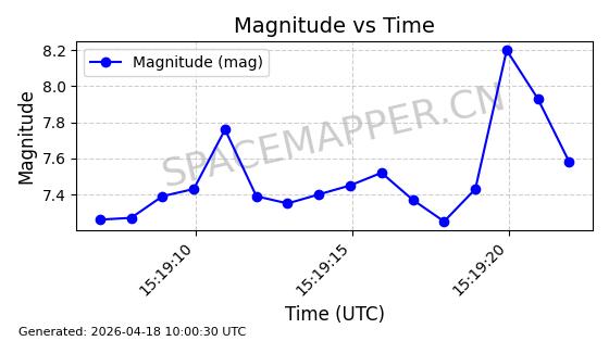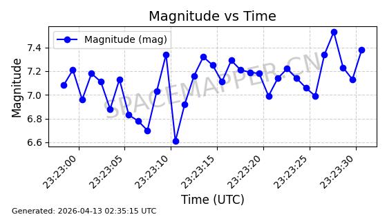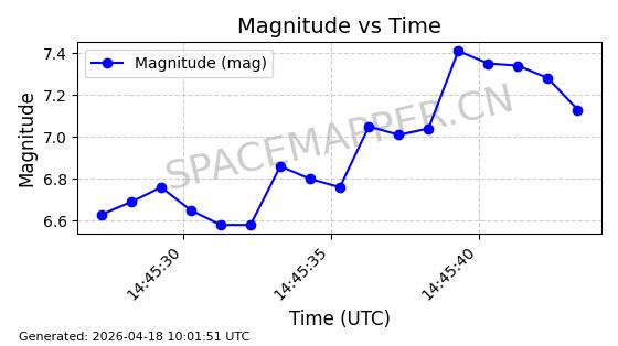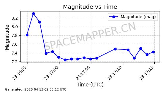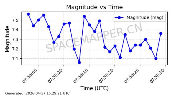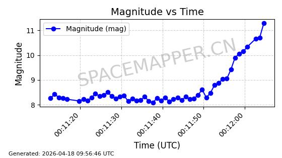 | STARLINK-32182 | 60319 | 60319 | 2024-07-28 同日期轨道 2024-133U 同批次轨道 | 在轨 | 94分钟 | 53.1595 | 474.402 | 476.038 | 0.0001193 | 2026-04-17 01:13:49 | ||