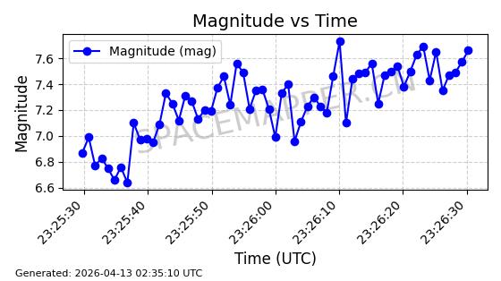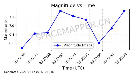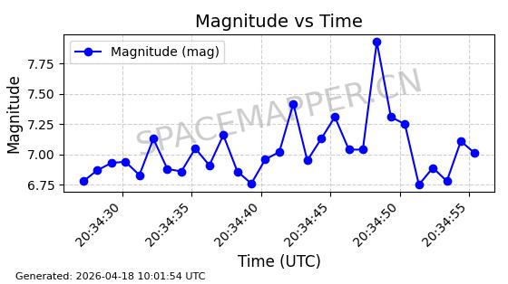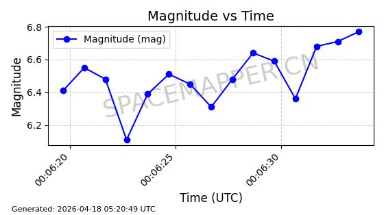 | STARLINK-32120 | 60265 | 60265 | 2024-07-27 同日期轨道 2024-131L 同批次轨道 | 在轨 | 94分钟 | 53.1613 | 472.2 | 473.354 | 0.0000841 | 2026-04-17 01:44:49 | ||