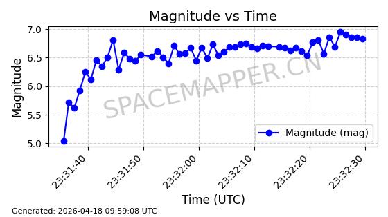 | STARLINK-32098 | 59704 | 59704 | 2024-05-08 同日期轨道 2024-086Y 同批次轨道 | 在轨 | 94分钟 | 43.0013 | 482.06 | 484.07 | 0.0001464 | 2026-04-17 07:01:56 | ||