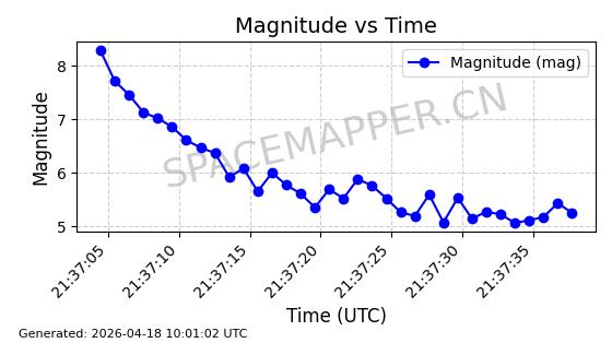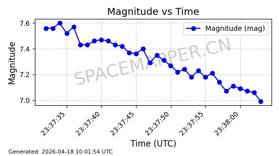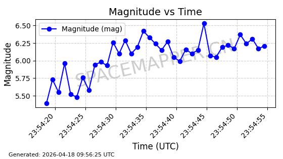 | STARLINK-32131 | 60153 | 60153 | 2024-06-27 同日期轨道 2024-120U 同批次轨道 | 在轨 | 94分钟 | 53.1596 | 474.341 | 476.165 | 0.0001330 | 2026-04-17 00:32:04 | ||