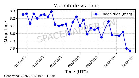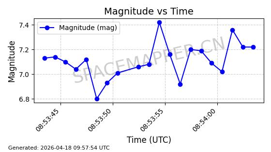 | STARLINK-32122 | 60285 | 60285 | 2024-07-28 同日期轨道 2024-132H 同批次轨道 | 在轨 | 94分钟 | 53.1606 | 474.493 | 475.981 | 0.0001085 | 2026-04-17 01:16:31 | ||
