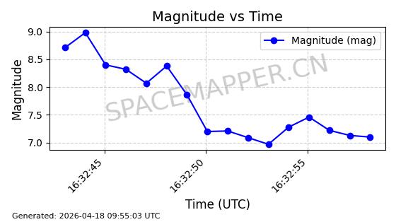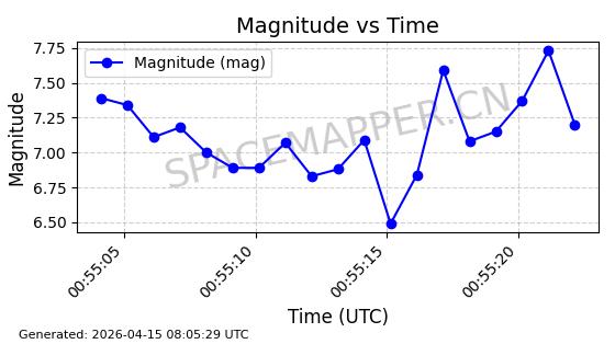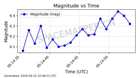| STARLINK-32084 | 60347 | 60347 | 2024-08-02 同日期轨道 2024-136U 同批次轨道 | 在轨 | 94分钟 | 53.1589 | 474.571 | 475.945 | 0.0001002 | 2026-04-16 16:18:43 | ||