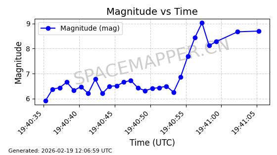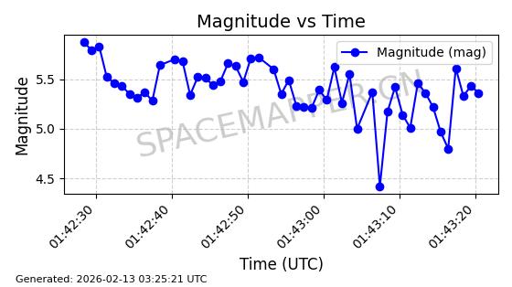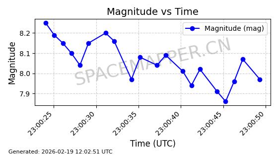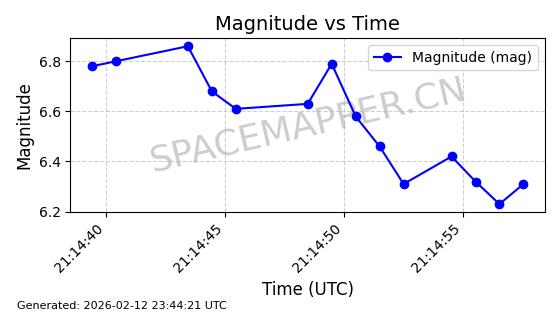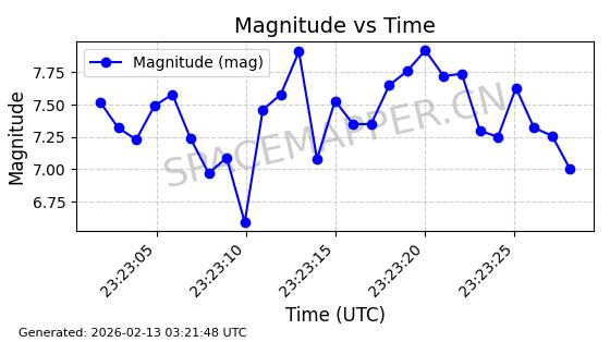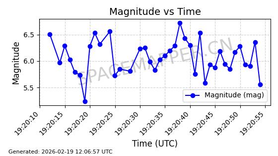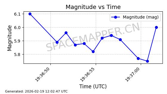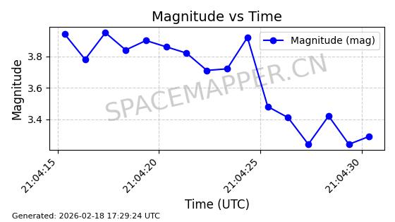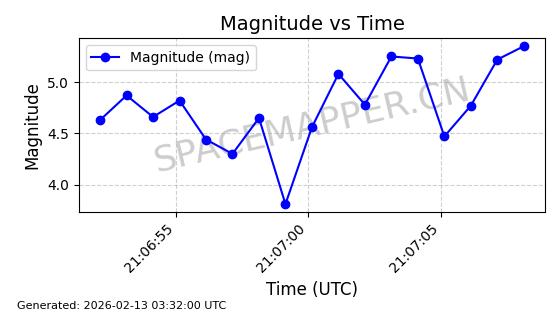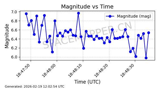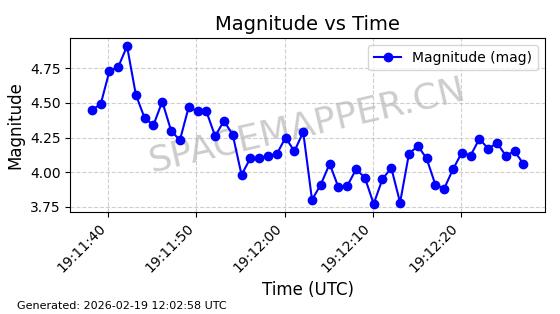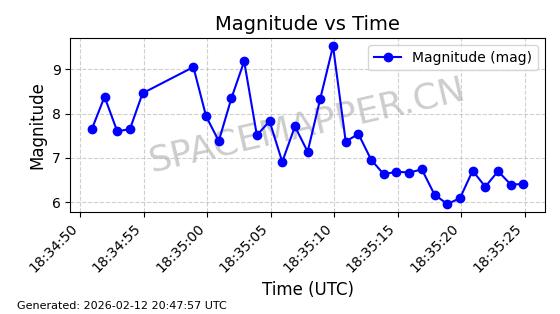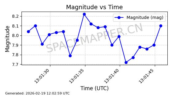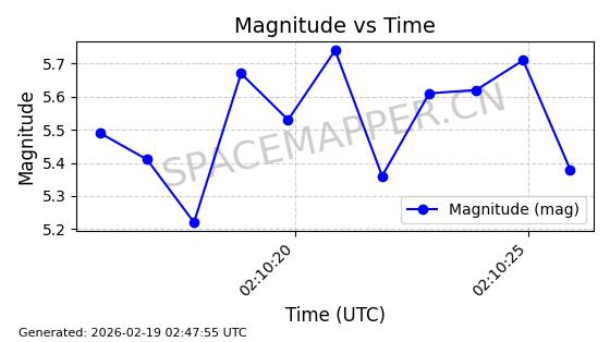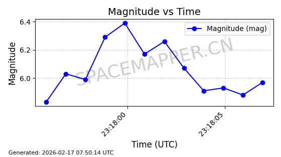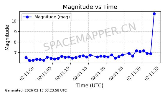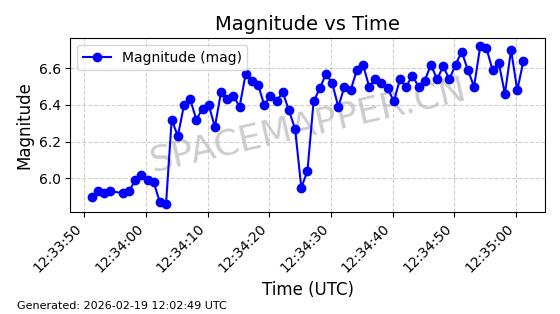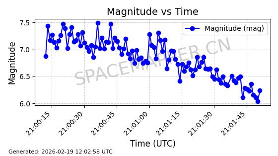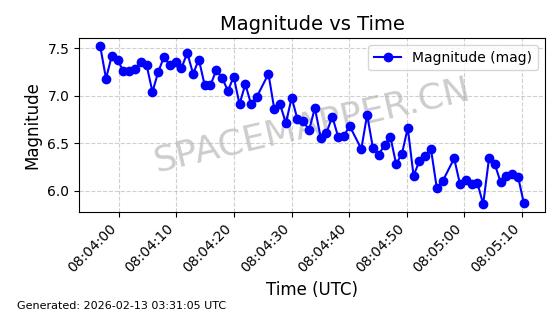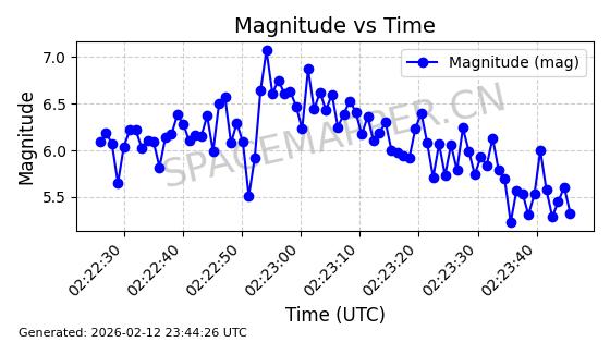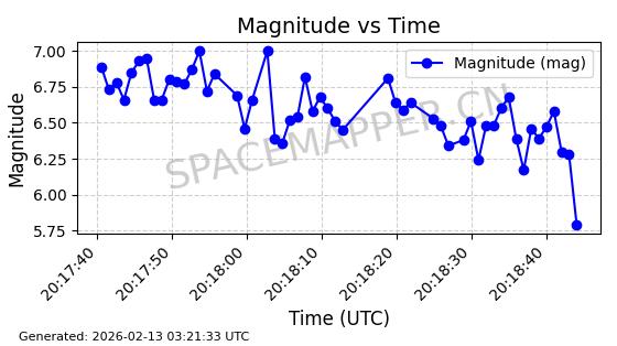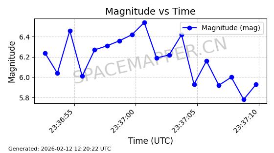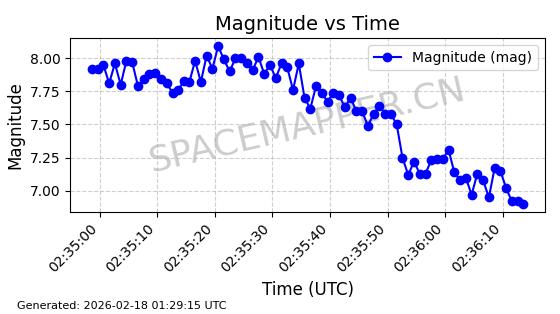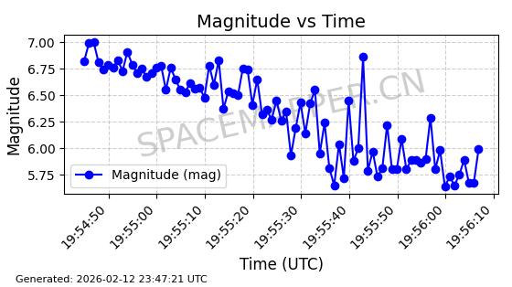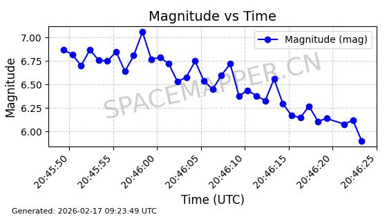 | STARLINK-5390 | 54872 | 54872 | 2022-12-28 同日期轨道 2022-177BE 同批次轨道 | 已陨落 | 88分钟 | 42.9855 | 166.167 | 176.465 | 0.0007861 | 2026-02-06 20:56:20 | ||