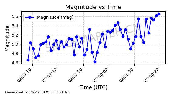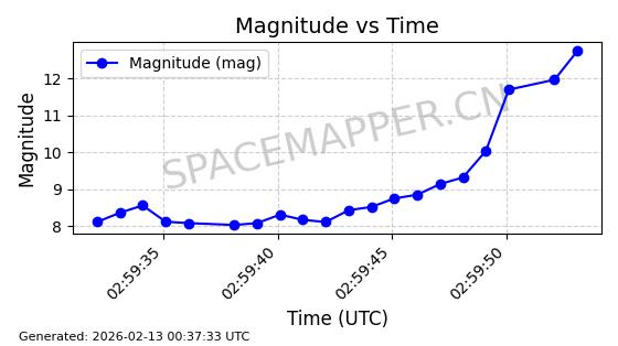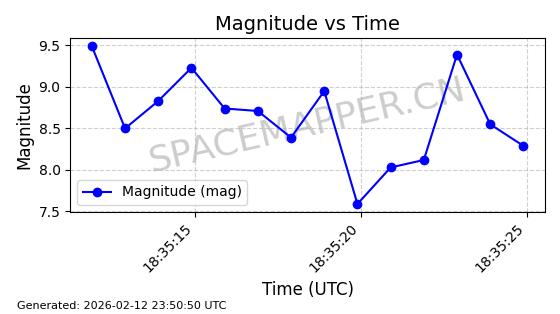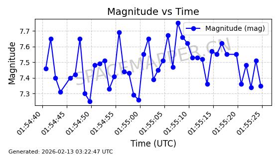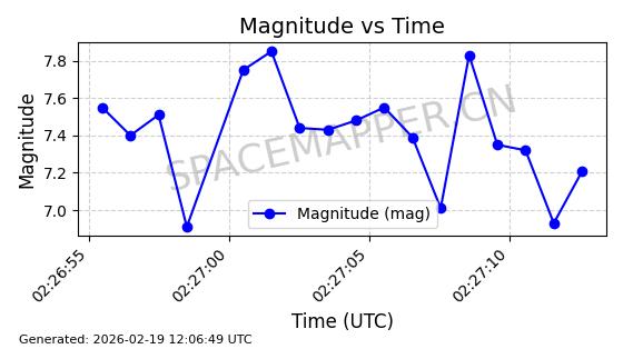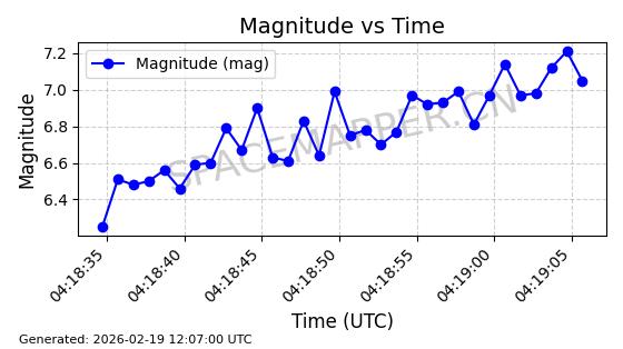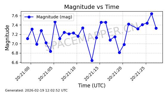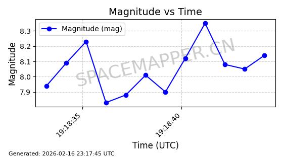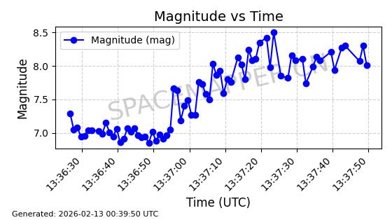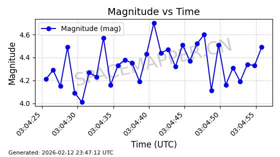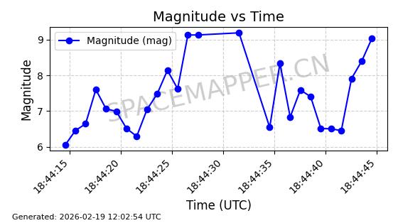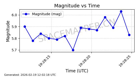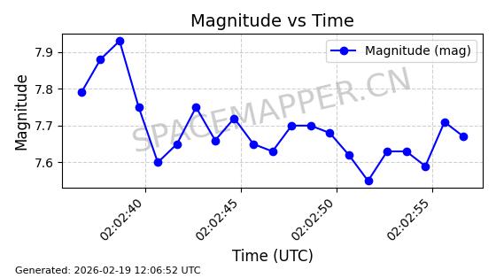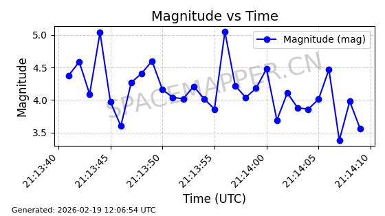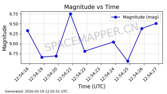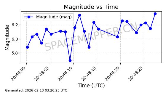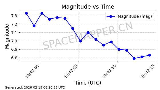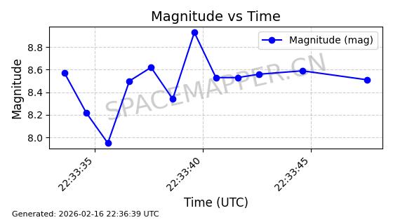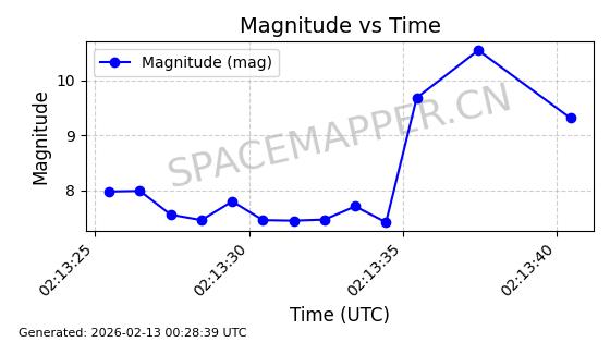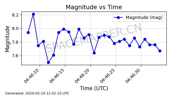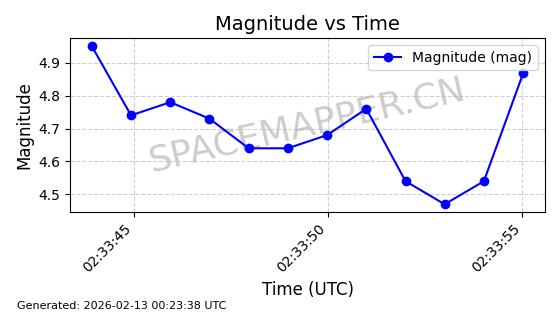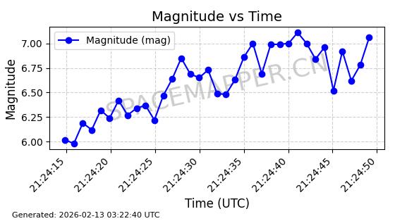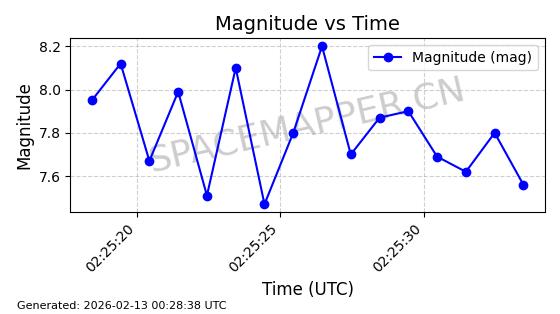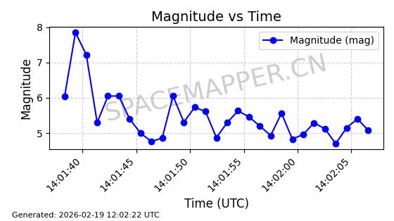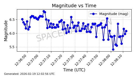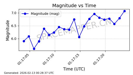| STARLINK-5390 | 54872 | 54872 | 2022-12-28 同日期轨道 2022-177BE 同批次轨道 | 已陨落 | 88分钟 | 42.9855 | 166.167 | 176.465 | 0.0007861 | 2026-02-06 20:56:20 | ||