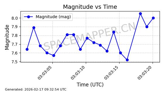 | STARLINK-5087 | 54850 | 54850 | 2022-12-28 同日期轨道 2022-177AG 同批次轨道 | 在轨 | 96分钟 | 43.0024 | 558.307 | 559.861 | 0.0001120 | 2026-02-17 21:20:51 | ||