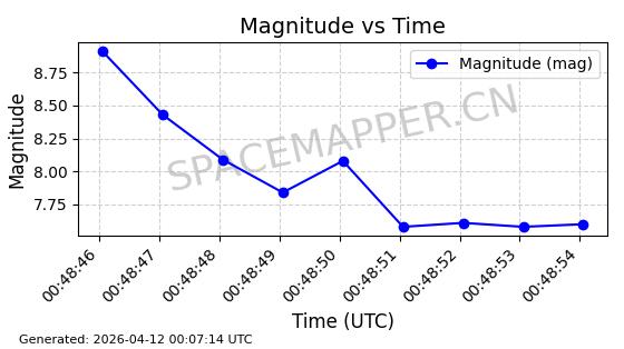 | STARLINK-32370 | 61635 | 61635 | 2024-10-23 同日期轨道 2024-191Q 同批次轨道 | 在轨 | 94分钟 | 43.0029 | 482.15 | 483.944 | 0.0001307 | 2026-04-11 00:20:36 | ||