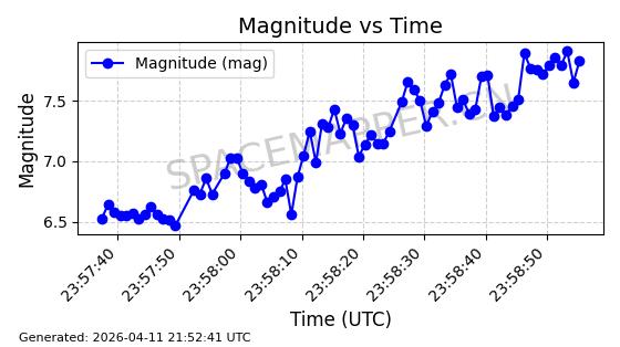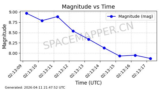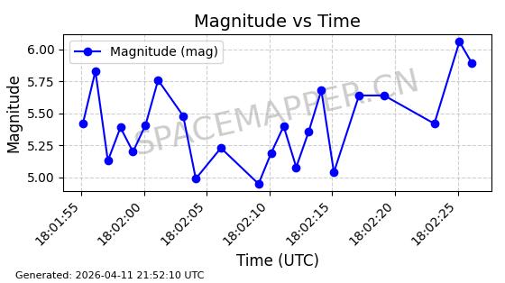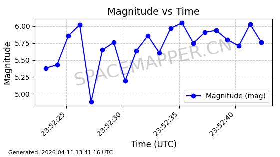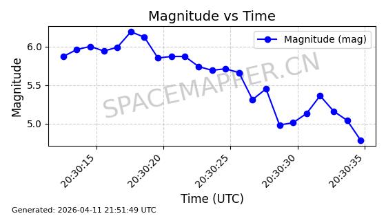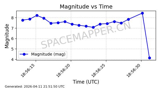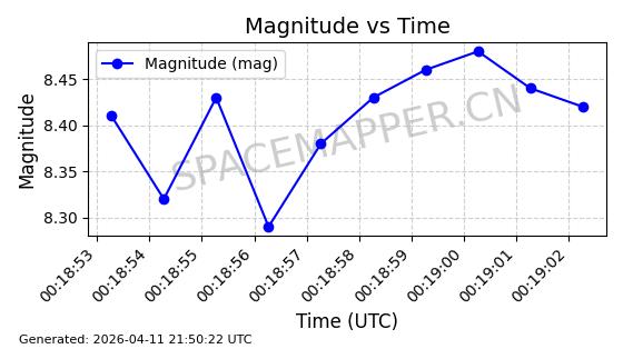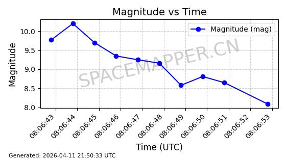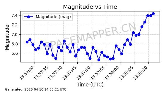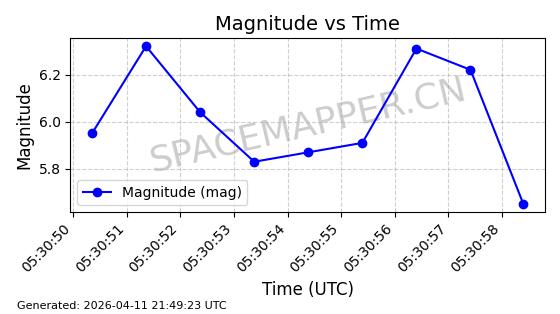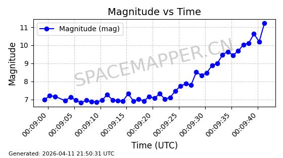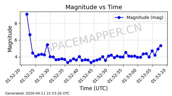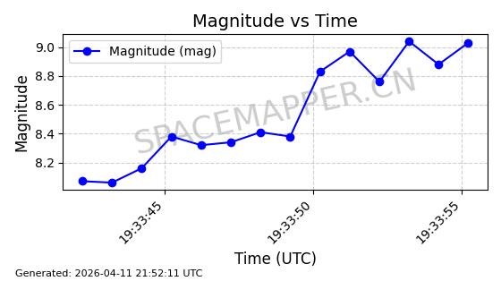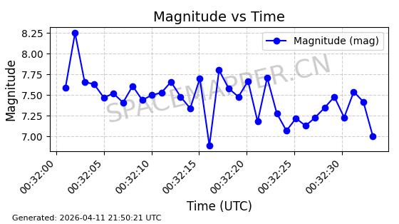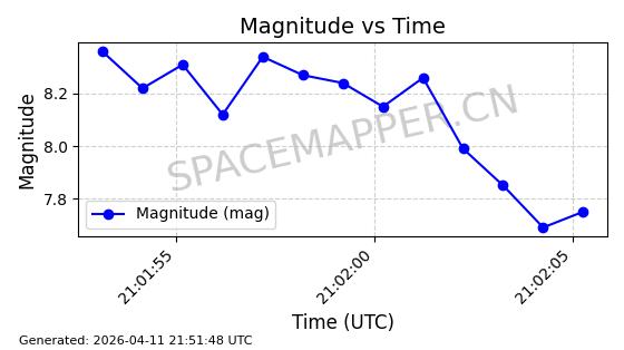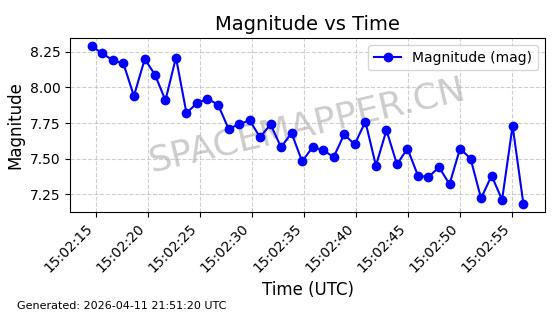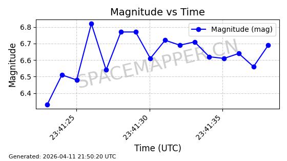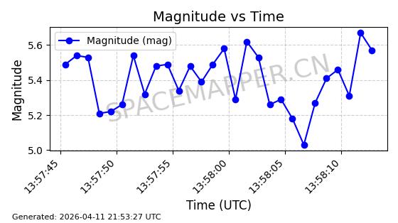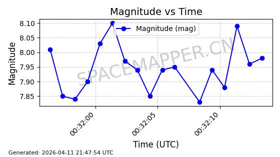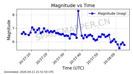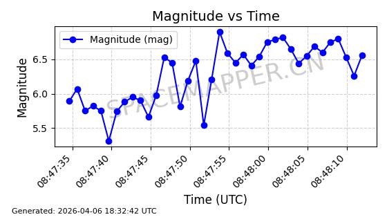 | STARLINK-32625 | 62154 | 62154 | 2024-11-30 同日期轨道 2024-224R 同批次轨道 | 在轨 | 94分钟 | 43.0055 | 482.61 | 483.42 | 0.0000590 | 2026-04-11 00:53:19 | ![]() | |