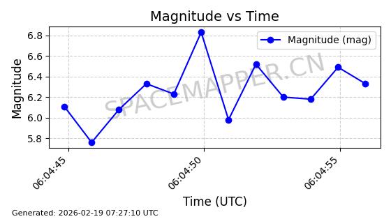 | STARLINK-6284 | 56403 | 56403 | 2023-05-04 同日期轨道 2023-061AF 同批次轨道 | 在轨 | 90分钟 | 42.9951 | 284.36 | 287.928 | 0.0002676 | 2026-02-18 00:42:36 | ||